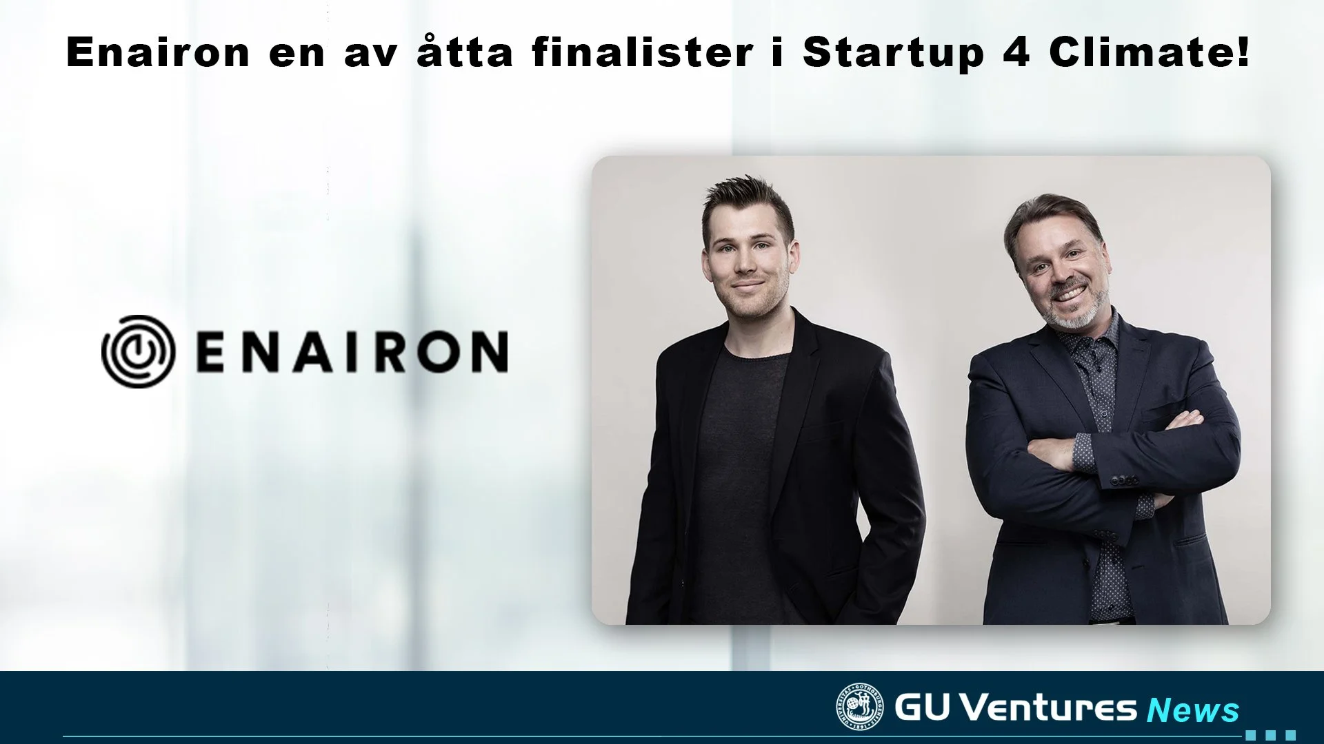 Startup 4 Climate är tävlingen som riktar sig till unga företag med idéer som kan påskynda energiomställningen och bidra till att begränsa den globala uppvärmningen till 1,5 grader. Nu har årets åtta finalister presenterats som utvalts bland 62 startupbolag. Vi är glada att meddela att företaget Enairon - som GU Ventures har samutvecklat och saminvesterat med Chalmers Ventures - har knipit en av finalplatserna.