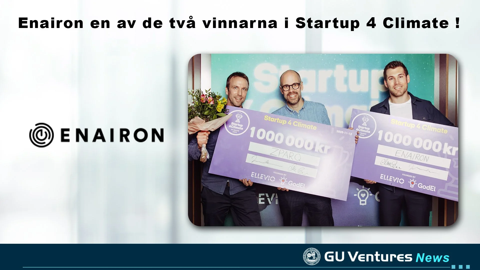 Den 13 november avgjordes finalen i Startup 4 Climate, en av Europas främsta tävlingar för unga företag som accelererar energiomställningen. Åtta svenska startupbolag tävlade om att förverkliga innovationer med både affärsmässig och klimatmässig effekt. Bland det imponerande startfältet utsågs Enairon och Zparq till vinnare, och belönades med 1 miljon kronor vardera.