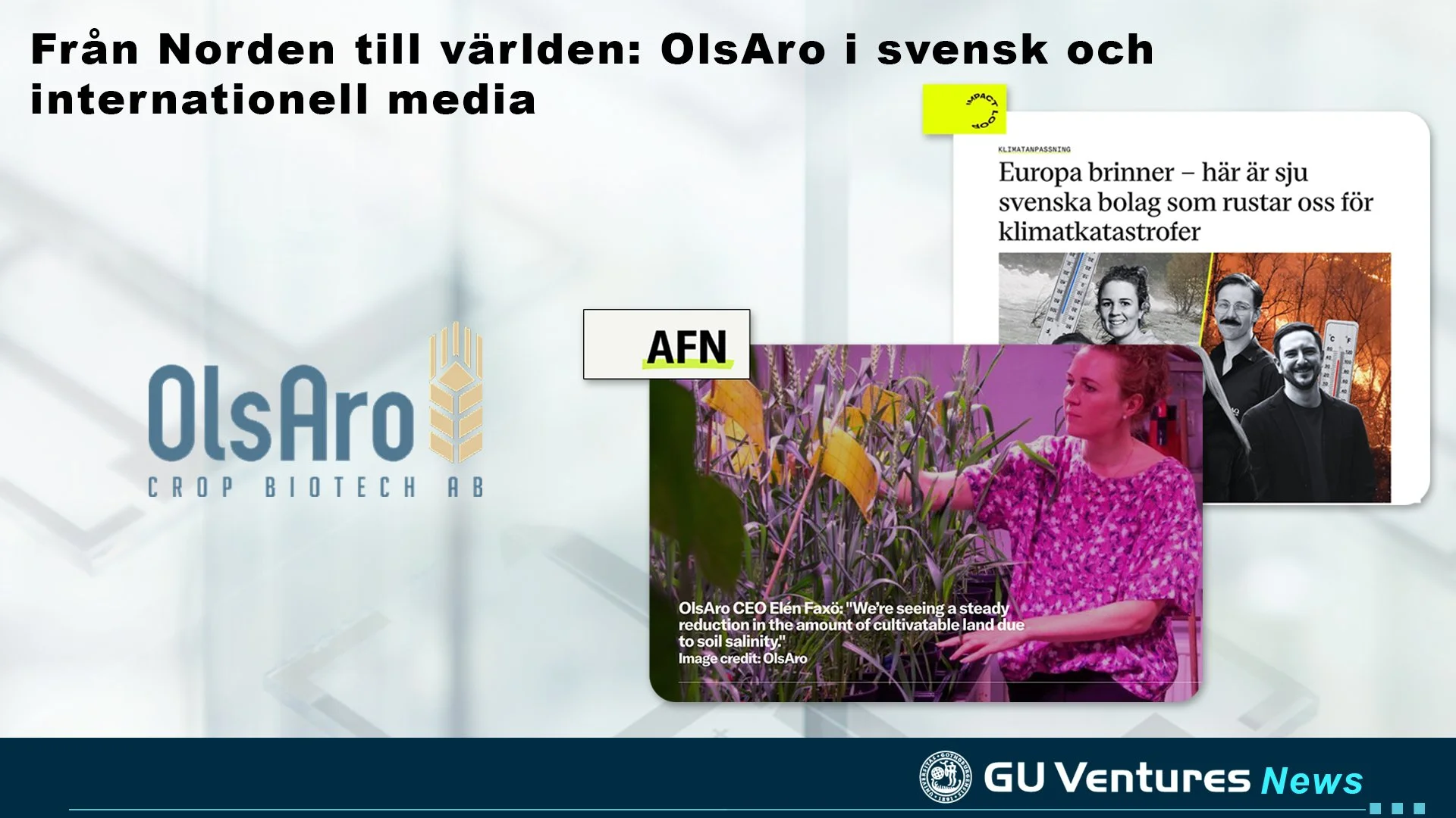GU Ventures bolag OlsAro Crop Biotech har tagit stora kliv framåt i sitt arbete för ett mer klimattåligt jordbruk. Det svenska agritech-bolaget utvecklar vetesorter som kan stå emot tuffare odlingsförhållanden, bland annat genom pågående försök med salttolerant vete på flera internationella marknader. I Indien samarbetar de med jordbruksjätten DCM Shriram – landets största aktör inom proprietära vetefrön – vilket visar att OlsAro menar allvar med sin ambition att skapa global impact. Nu uppmärksammas bolaget både i internationella AgFunder News såväl som i svenska nättidningen Impact Loop.
