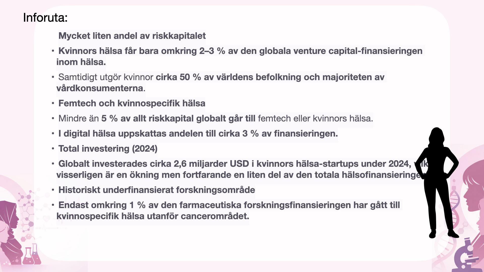 Trots att kvinnor står för ungefär hälften av världens befolkning går endast omkring 2–3 procent av riskkapitalet inom hälsosektorn till företag som utvecklar lösningar för kvinnors hälsa.